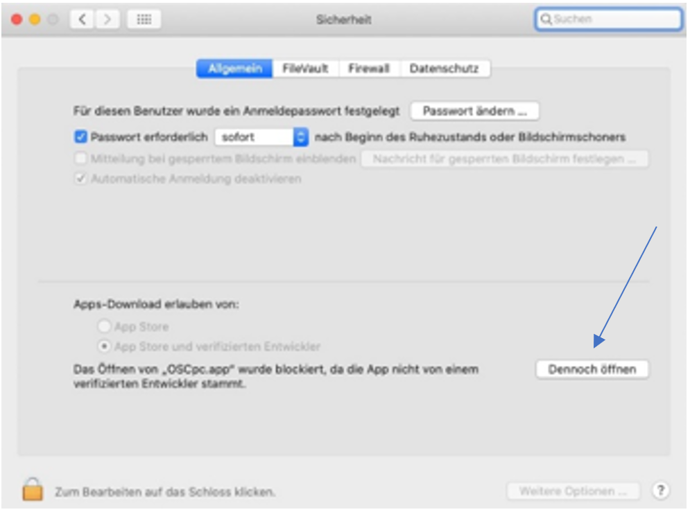 Hierauf erscheint ein weiteres PopUp-Fenster, mit dem Sie die Installation der Datei OSCpc.app durch einen Klick auf den Button „Öffnen“ starten.