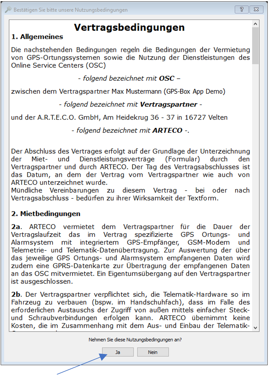 Nach der Anmeldung sind einmalig die Vertragsbedingungen zur Nutzung der Hard- und Software zu akzeptieren.