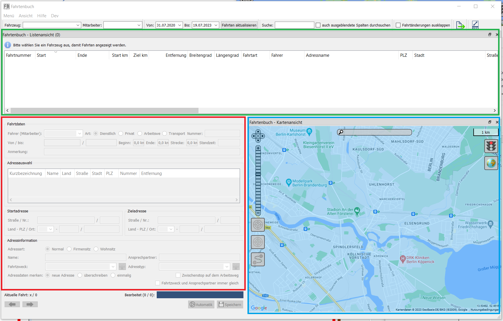 Nach dem Klick auf das Fahrtenbuchicon im Hauptfenster erscheint das Fahrtenbuchfenster, das aus den Bereichen Fahrtenbuch - Listenansicht, Fahrtenbuch - Kartenansicht sowie den Fahrtdaten mit den zugehörigen Adressinformationen besteht.