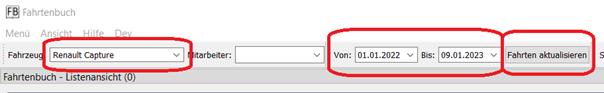 Zur Bearbeitung der Fahrten sind zunächst ein Fahrzeug und ein Zeitraum auszuwählen. Immer wenn der Zeitraum geändert wird, muss auf „Fahrten aktualisieren“ geklickt werden, damit der Filter angewendet wird. Alternativ kann zum Fahrten aktualisieren auch die Taste F5 oder die Kombination Strg+R (Windows) oder Cmd+R (Mac) verwendet werden.