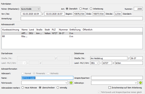 Haben Sie alle notwendigen Felder zur Zieladresse ausgefüllt und „neue Adresse“ ausgewählt, wird diese beim Speichern der Fahrt angelegt. Die eingegebenen Adressdaten stehen Ihnen zur Bearbeitung weiterer Fahrten als Auswahl zur Verfügung. Dies ist besonders bei der Nutzung des „Automatik“-Modus (3.5.) hilfreich. Bei der Änderung von Adressen ist es möglich, den Datensatz als „neue Adresse“ anzulegen, den vorhandenen zu „überschreiben“ oder die Adresse „einmalig“ nur für die ausgewählte Fahrt im Fahrtenbuch zu speichern.