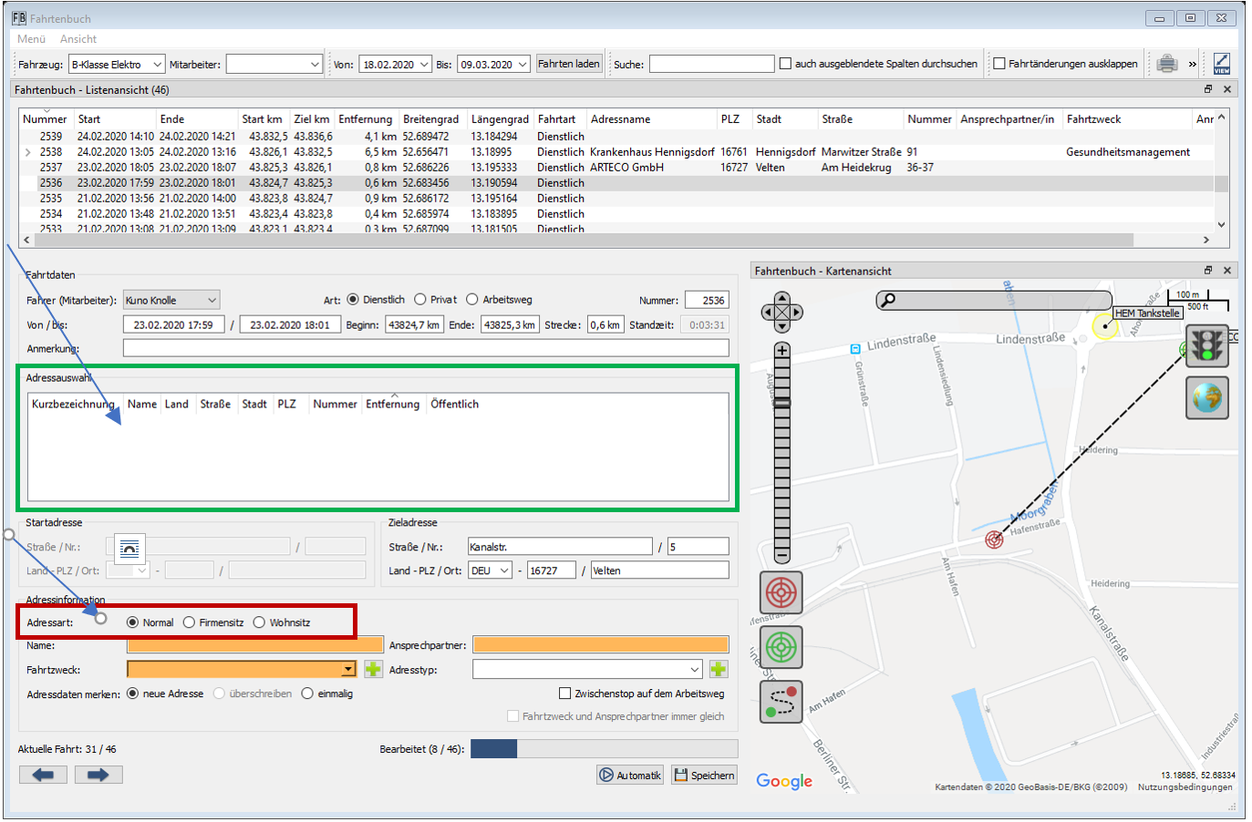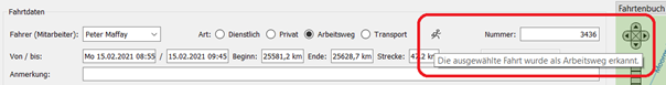 Konnten nicht alle Fahrtenbucheinträge automatisch bearbeitet werden, da sie die Auswahlkriterien nicht erfüllt haben, wechselt das Programm in die manuelle Bearbeitung zu der ersten unbearbeiteten Fahrt.