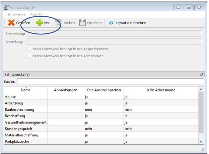 Fast jeder Fahrt muss ein Fahrtzweck zugeordnet werden. Sind noch keine Einträge erfasst oder der gewünschte Fahrtzweck noch nicht vorhanden, können neue Fahrtzwecke über den Button „Neu“ :Neu: angelegt werden.