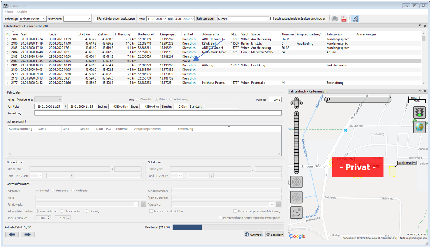 Nach der Umwandlung werden in der Fahrtenbuchanzeige die Start- und Zielpositionen gelöscht und die Fahrt als privat gekennzeichnet. Bei Privatfahrten können Sie weiterhin der Fahrt einen Mitarbeiter / Fahrer zuordnen und Anmerkungen eintragen.