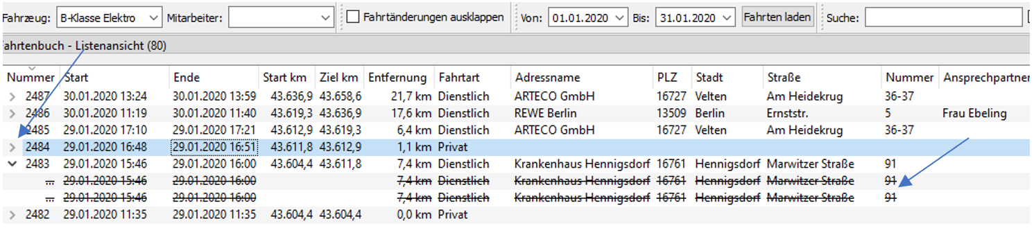 Der alte Eintrag wird im Fahrtenbuch durchgestrichen dargestellt. Sollen alle geänderten Fahrtenbucheinträge angezeigt werden, aktivieren Sie die Option „Fahrtänderungen ausklappen“.