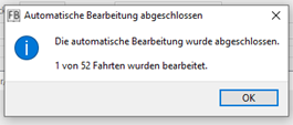 Ist die Bearbeitung abgeschlossen, erscheint ein Mitteilungsfenster, in dem die Anzahl der automatisch bearbeiteten Fahrten ausgewiesen wird.
