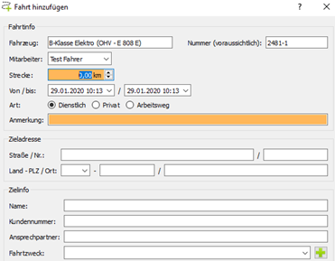 Nach Auswahl einer Fahrt werden die bereits vorhandenen Daten im Bereich „Fahrtdaten“ angezeigt. Sollte das Fahrzeug von mehreren Mitarbeitern / Fahrern genutzt werden, kann die ausgewählte Fahrt einem Mitarbeiter / Fahrer zugewiesen und bestimmt werden, um welche Fahrt Art (Dienstlich, Privat, Arbeitsweg) es sich handelt. Standardmäßig ist „Dienstlich“ vor eingestellt, außer bei Fahrten, die über den Privattaster als „privat“ gekennzeichnet wurden.