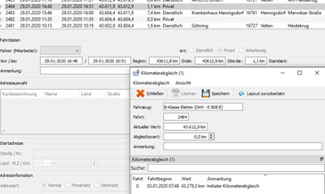 Der initiale Kilometerstand wird der Fahrt 0-1 zugeordnet. Aufgrund des hier eingetragenen initialen Kilometerstandes werden alle im Fahrtenbuch vorhandenen Start- und Ziel-km-Einträge neu berechnet.