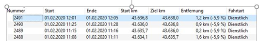 Im Bereich „Fahrtenbuch-Listenansicht“ werden entsprechend Ihrer Auswahl alle Fahrtdaten nach Fahrtnummern aufsteigend sortiert angezeigt. Soll die aktuellste Fahrt in der obersten Zeile der Tabelle stehen, ändern Sie die Sortierreihenfolge mit einem Klick auf die Spalte „Nummer“.