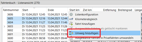 Um einen Umweg zu erfassen, wählen Sie mindestens eine Fahrt aus. Wenn Sie mehrere Fahrten ausgewählt haben, müssen diese aufeinanderfolgend sein. Mit einem Rechtsklick öffnet sich das Kontextmenü in dem Sie den Menüpunkt „Umweg hinzufügen“ auswählen.