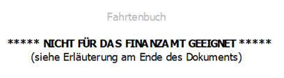 Dieser Ausdruck ist für die Vorlage beim Finanzamt gedacht. Es werden alle notwendigen Informationen zu jeder Fahrt sowie Änderungen an Fahrten gedruckt. Wenn nicht alle Voraussetzungen erfüllt wurden, erscheint eine Mitteilung auf jeder Seite. Die Gründe dafür sind vor den Anhängen (Kilometerabgleiche sowie Umwege) aufgelistet. Erst wenn alle Ursachen behoben wurden, wird diese Mitteilung nicht mehr angezeigt.