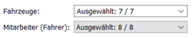 In diesem Ausdruck wird für jeden Fahrer zusammengefasst, wie viel km mit welchem Fahrzeug gefahren wurden. Bei diesem Bericht gelten nicht die Fahrzeug- sowie Mitarbeiterfilter aus der Fahrtenbuchtoolbar, sondern es werden die ausgewählten Fahrzeuge sowie Mitarbeiter aus dem Berichtsdialog verwendet (siehe Abbildung “Filter Fahrzeuge und Mitarbeiter”).